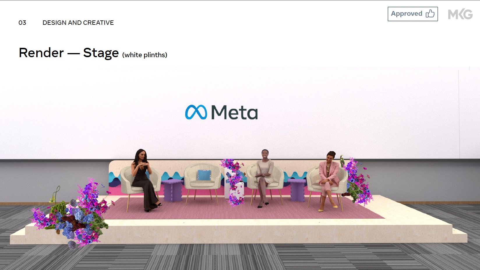 To design a space that inspires connection between the most amazing list of women attendees. Using Meta IWD brand guidelines, staying visually parallel to the London event to maintain consistency and creating multiple points of interaction leading up to the speaker series.